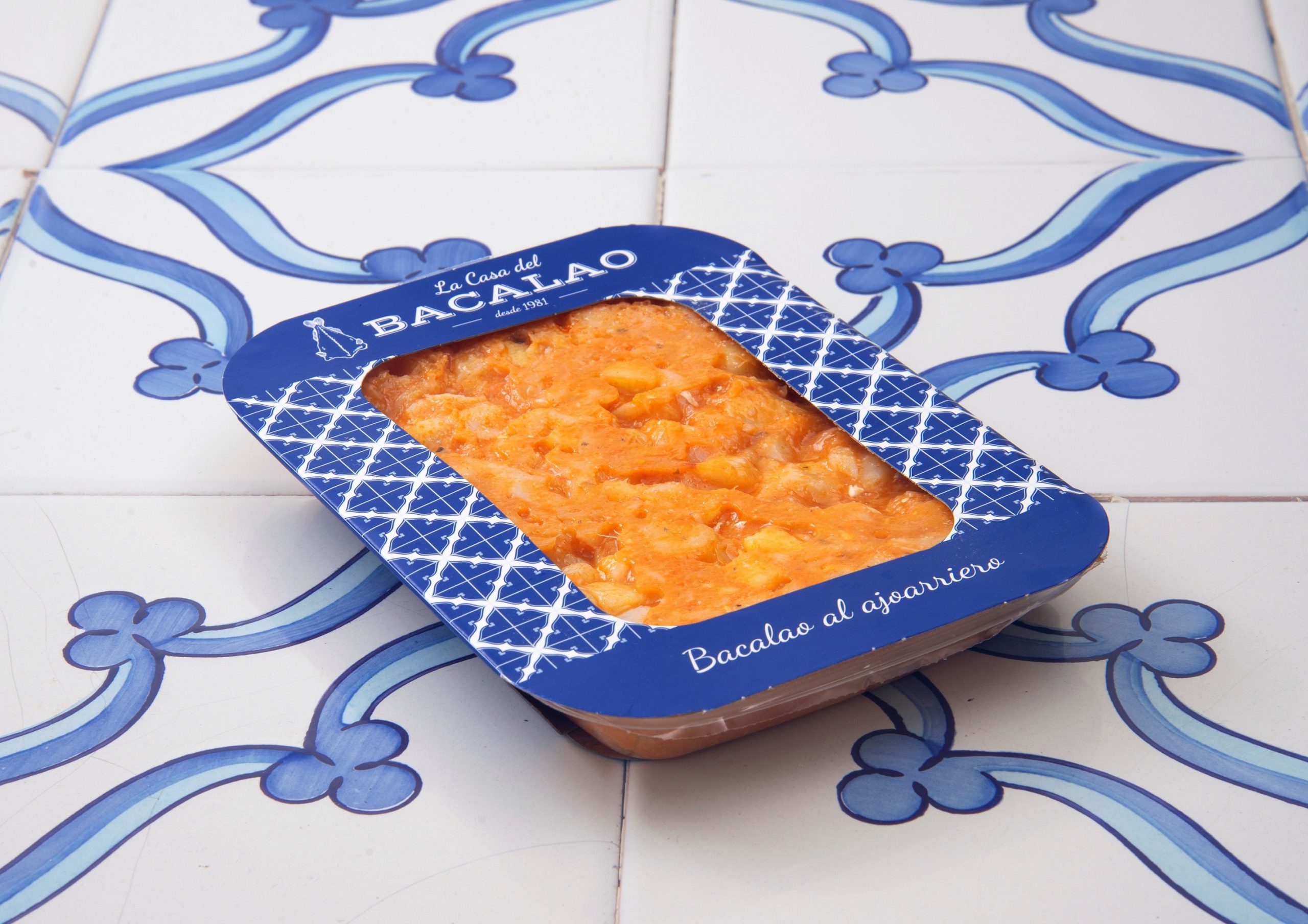 Bacalao desalado (Gadus Morhua) 52%, patata, pimiento rojo, pimiento verde, calabacín, pimiento choricero, cebolla, tomate, aceite de oliva virgen, ajo, azúcar, almidón de maíz y sal.